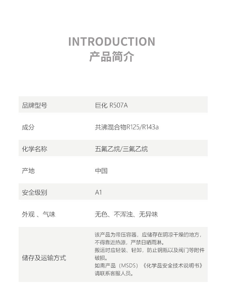 巨化R507A制冷劑,別名R507,商品名稱有Genetron AZ-50、Genetron 507、SUVA 507等。廣泛用于新冷凍設(shè)備上的初裝和維修過程中的再添加。